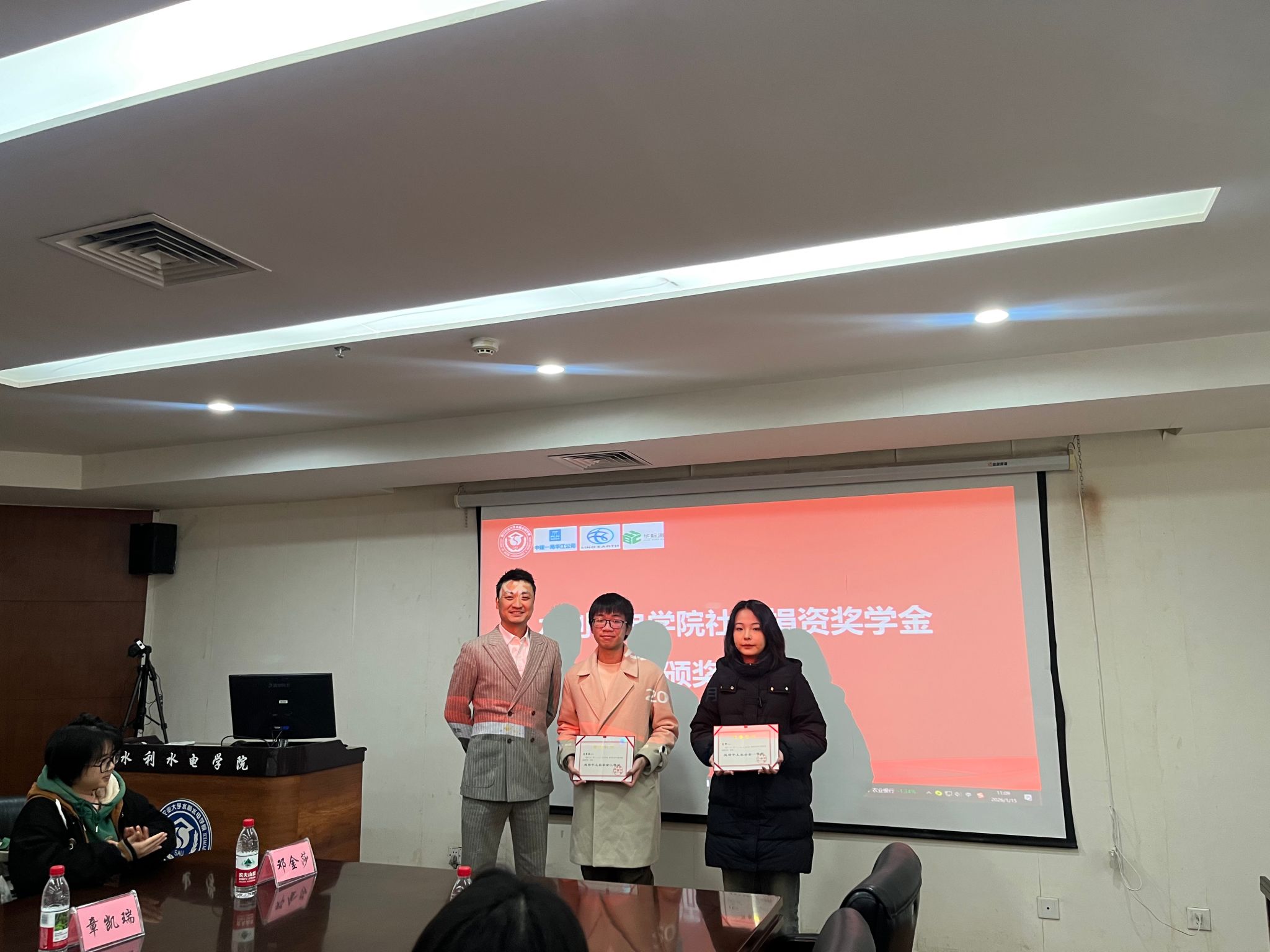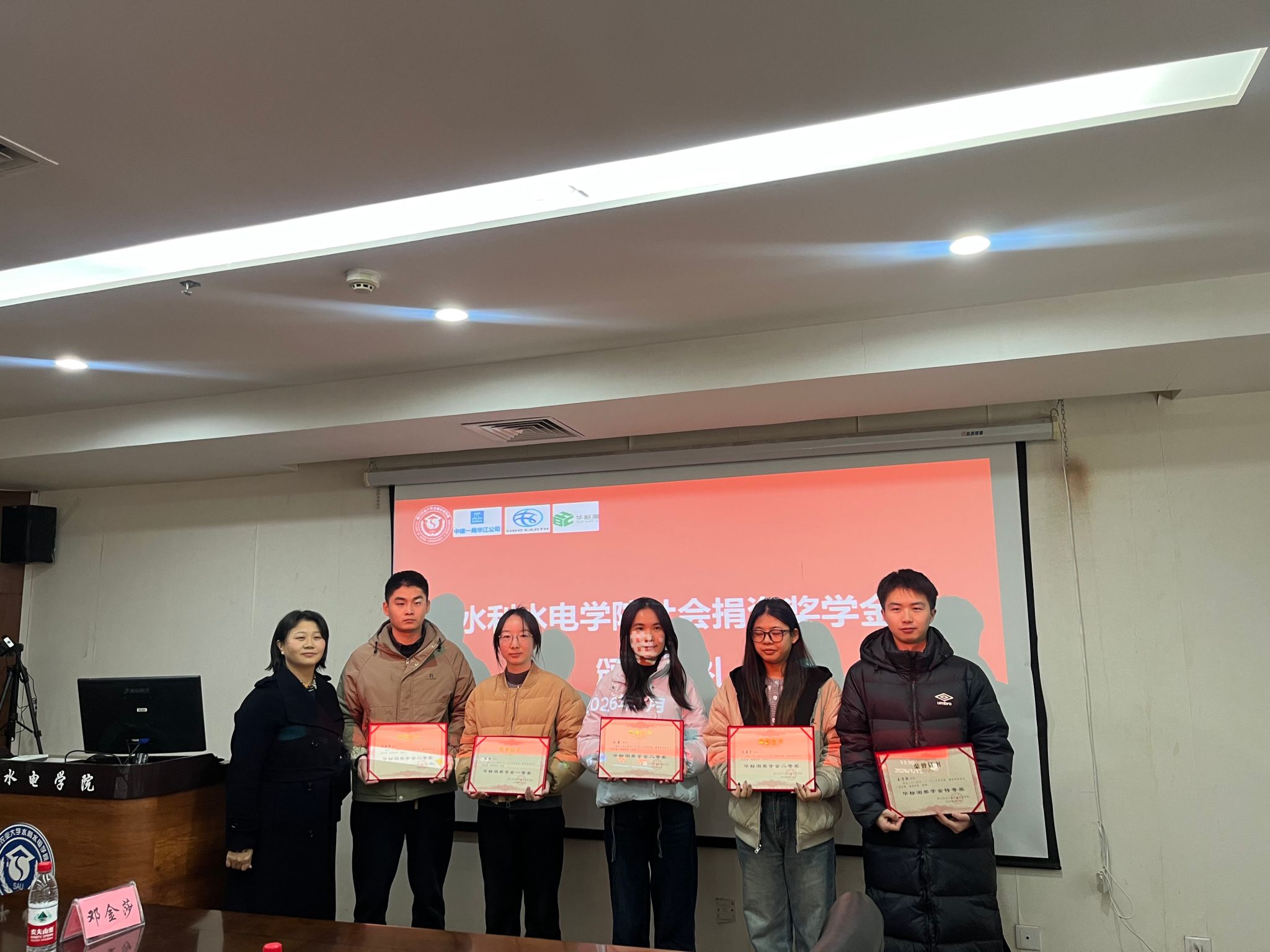 典礼最后举行颁奖仪式。胡建与企业代表共同为获奖员工颁发中建一局华江奖学金、成都中土奖学金、华标测奖学金的荣誉证书。此次颁奖典礼的举办,不仅搭建了校企合作育人的桥梁,更激励了水利学子以榜样为力量,勇担时代使命,为水利水电事业发展贡献青春力量。