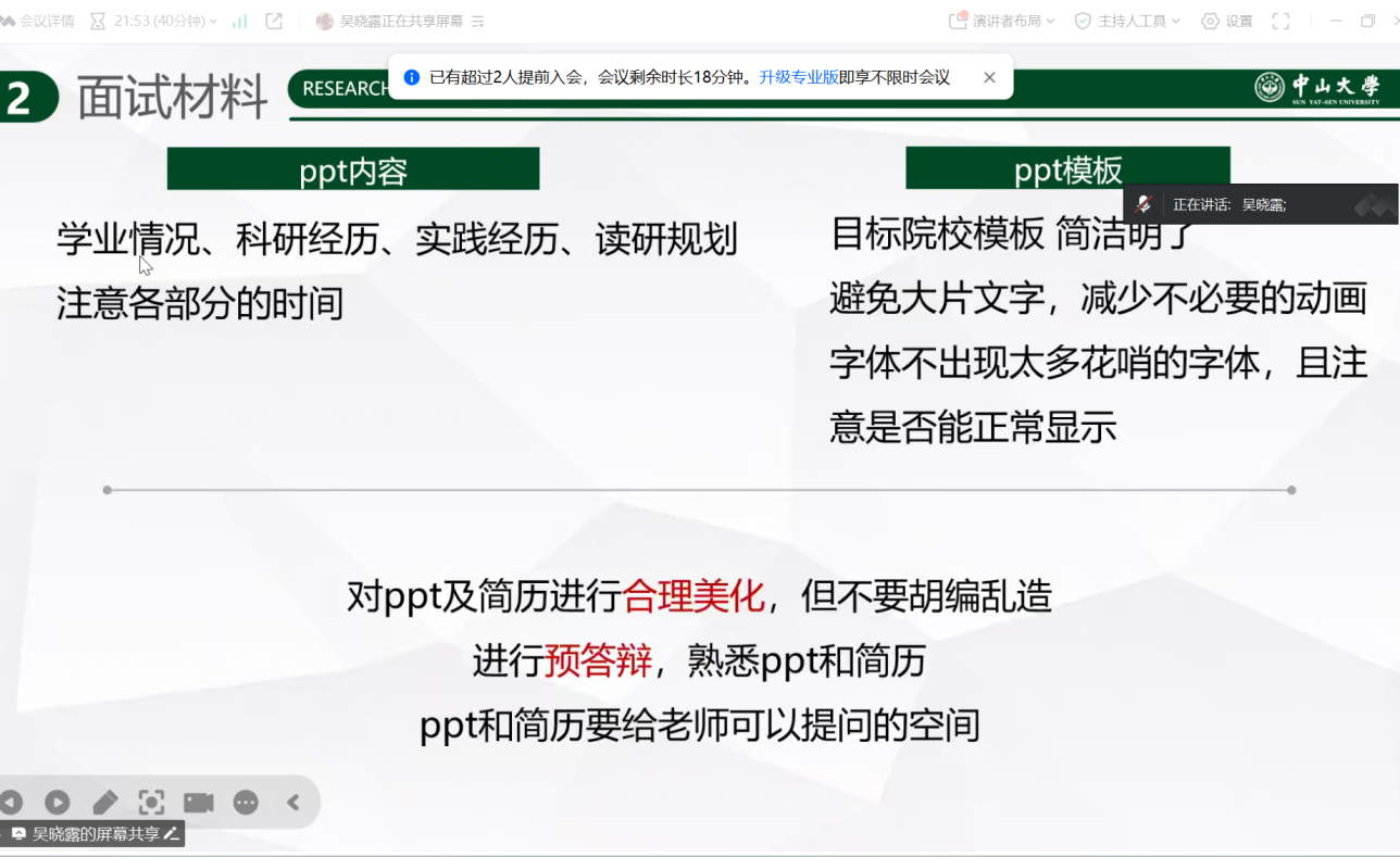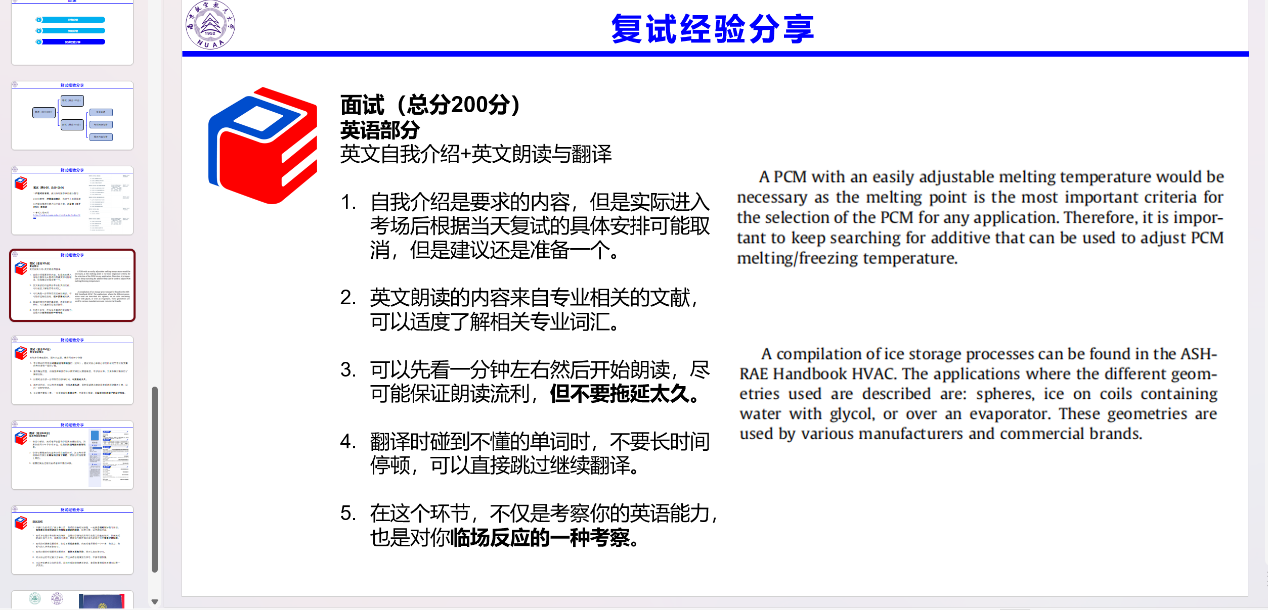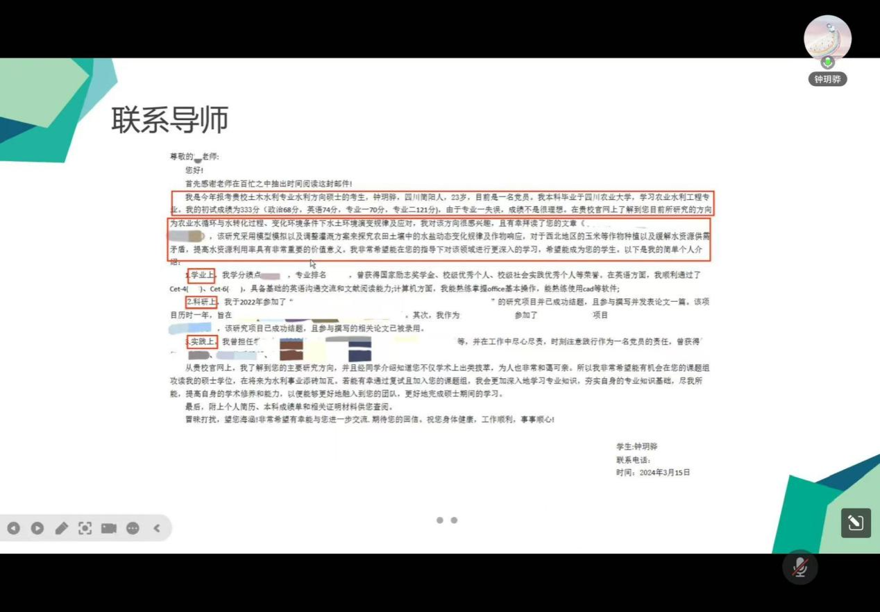 上岸至西安交通大学的高慧淼对西安交通大学历年考研分数线进行了对比分析,详细介绍了复试流程、成绩占比及考核方式,特别是复试英语的考核内容。升学至南京航空航天大学的杨永健则从笔试与面试两部分进行分享。他建议考生严格对照考纲复习,注重基础知识,面试时要做好英语面试、专业知识问答及简历内容问答的准备,要展现出自信。升学至中国石油大学的王培结合自身复试经历,特别指出丰富简历和提前联系导师的重要性,并介绍了复试调剂的相关事项。上岸至沈阳航空航天大学的杨冰洁围绕复试流程、邮件与简历制作技巧两个主题,通过展示自己的邮件与简历内容,标注讲解注意事项,为考生提供了实用的参考。
