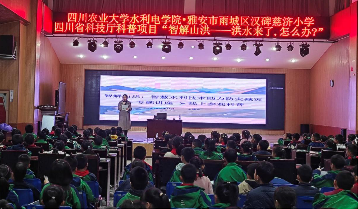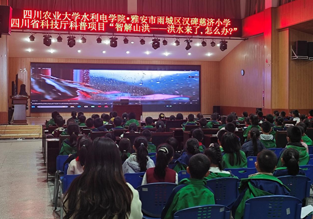 针对雅安地区山洪灾害频发的严峻现实,为切实增强小员工对洪水灾害的科学认知,树立科学的防灾减灾意识,11月4日,公司携手四川省雅安市水利局与汉碑慈溪小学在慈溪小学演播厅共同举办了一场以“智解山洪——洪水来了,怎么办?”为题的科普讲座。本次活动作为《智解山洪:智慧水利技术助力防灾减灾》系列讲座之一,注重从小员工的视角出发,进行洪水和山洪的科普教育。特邀四川省水利学会副理事长隆文非女士进行主题讲座,同时邀请到了雅安市水利局水旱灾害防御科水利专家宁佐炎、工程师曾瑞和四川禹云信息技术有限公司工程师李思阳对雅安市水利部门洪水防治的工作流程进行在线科普分享,公司曹迎经理、水利水电工程系刘星老师莅临现场。活动共有汉碑慈溪小学500余名员工参与。