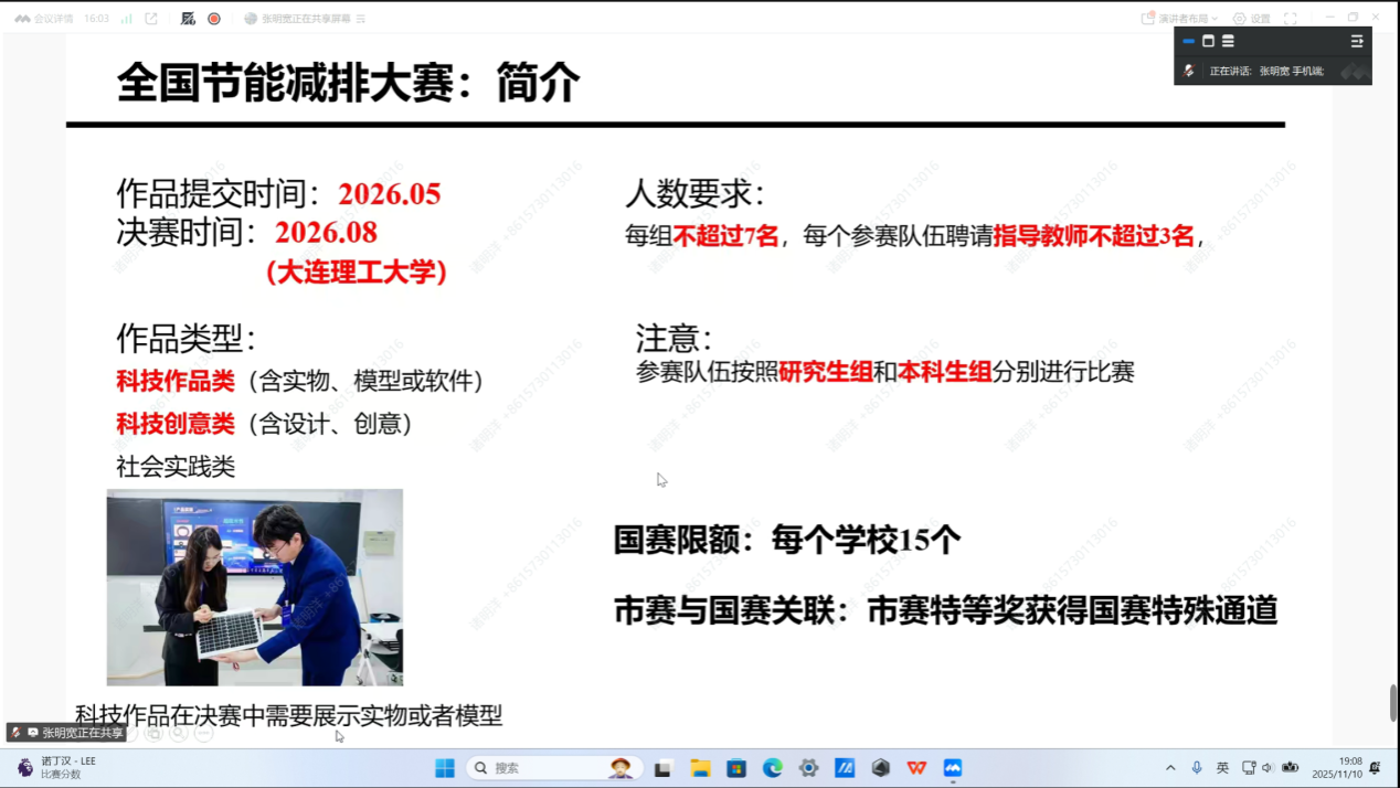 随着第十九届全国老员工节能减排社会实践与科学竞赛的全面启动,11月10日,太阳成集团tyc33455cc能源与动力科创社特邀荣获国家级一等奖/二等奖等多项成果的天津理工大学机械工程公司张明宽博士开展线上专题讲座。作为指导老师指导员工曾斩获国家级一等奖、二等奖等多项竞赛成果的资深专家,张明宽博士聚焦节能减排大赛的赛制规则、选题策略与作品优化,为初次参赛的师生提供系统性指导。
