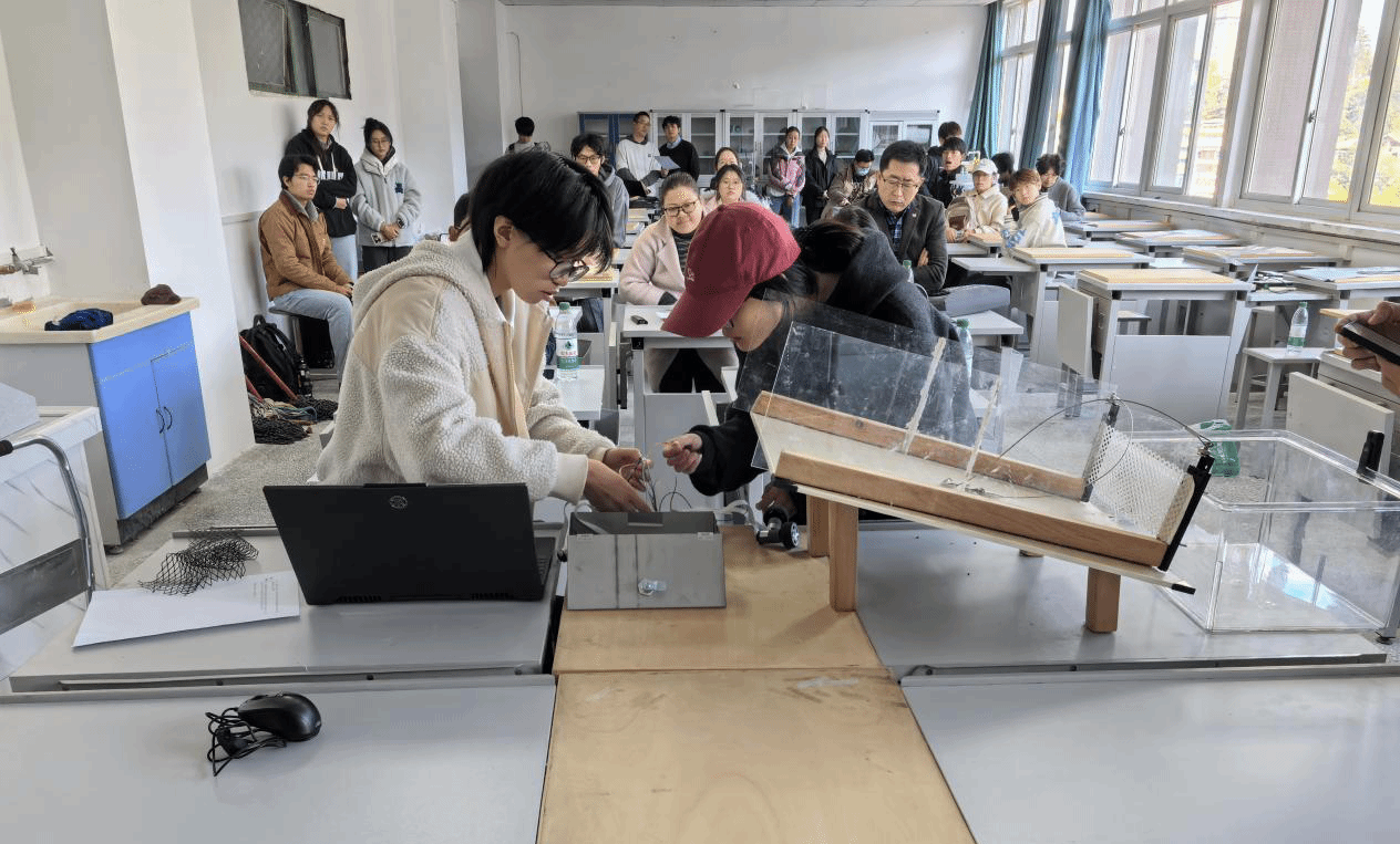 本次比赛分初赛和决赛进行,虽准备时间紧张,但参赛同学热情高涨,积极参与,主动作为,顺利完成模型制度,13个队伍现场参赛队伍表现出色。在决赛现场,各参赛小组围绕设计的可行性、创新性、科学性和先进性等方面对参赛作品进行介绍,并做现场演示。马露遥团队的“民族语音交互式水光蓄互补智慧农业系统”,、针对我国西部水资源匮乏、供能局限且民族众多的河谷地区,打造全国产化水光蓄互补智慧农业系统,系统以四川省凉山彝族自治州主轴,搭载全国首创彝汉双语智能中枢,内置多民族方言声纹扩展接口,不仅解决农业灌溉难题,还通过技术普惠与文化尊重,促进民族融合与可持续发展,形成绿能、科技、农业与民族文化的良性互动与逻辑闭环。黄莎莎团队““平急两用”的便携式矿区应急救灾智能净水装置”针对矿区周边长期面临的饮用水污染问题和矿区灾害发生时应急供水能力不足的现状,采用添加光催化剂的PLA-Ag/PDA/g-C3N4协调改性PVDF超滤膜,设计的一款“平急两用”便携式矿区应急救灾智能净水装置,能够高效去除水中重金属离子、化学污染物、悬浮颗粒及病原微生物,确保出水达到直饮标准,有效应对矿区常见的重金属与有机物复合污染问题。孙钰杰团队“基于农村生活污水治理的厌氧滤池+人工湿地组合净水装置”创新式以玉米芯为原料的改性生物炭为填料,设计的“厌氧滤池+人工湿地”智能净水装置,其独特的孔隙结构可大幅提升微生物附着能力与磷吸附效能,厌氧滤池后续的人工湿地单元通过精心设计的植物层、复合填料层及梯度孔隙过滤层,与微生物协同实现深度脱氮除磷。本次评审委员会本着公平、公正、科学、规范的竞赛规则,从参赛作品结构设计、制作合理性、创新性、科学性、先进性的应用等方面进行严格评审。