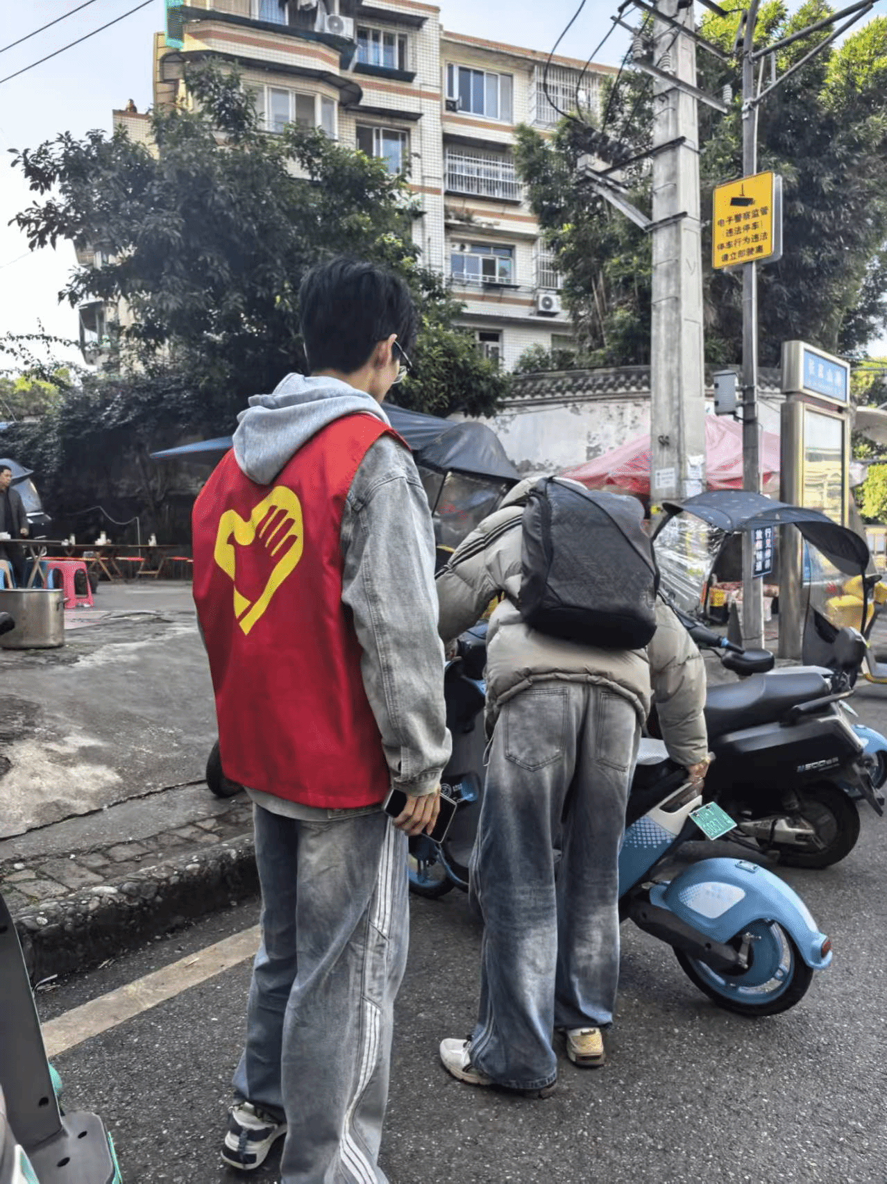 另一小组的整治现场更显忙碌:两名志愿者合力扶住一辆卡在转角的电动车,一人稳住车头避开墙角,一人托起车尾缓慢平移,鞋底在台阶上蹭出轻微声响;看到斜停在道路一旁的电动车,志愿者快步上前,双手紧握车把将车拉回路面,再推着车沿道路走向指定停车区,车轮滚动的咕噜声此起彼伏;面对车座积灰、轮胎瘪气的“僵尸车”,四人一组分工协作,有人抬车头、有人扶车身,踩着地砖上的落叶往临时存放点运送,额角渗出的汗珠顺着脸颊滑落,没人停下脚步,红马甲在阳光下晃动,成了社区里最醒目的风景线。志愿者梁静芸回忆道:“在志愿服务过程中,有一个好心的老奶奶给我们送了一些好吃的,感觉志愿过程的劳累都瞬间散去了,并且能看到街道在我们的整治下变得有序,我们也很有成就感。”