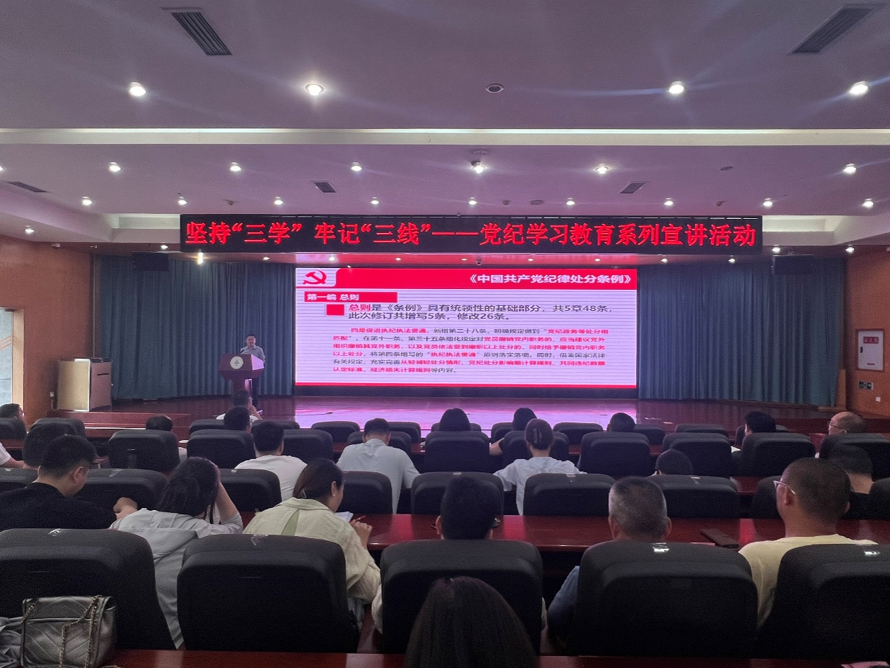 为深入学习贯彻习近平总书记关于党纪学习教育的重要讲话和重要指示精神,贯彻落实中共中央办公厅《关于在全党开展党纪学习教育的通知》以及公司开展党纪学习教育的部署要求,切实推动党纪学习教育入脑入心,5月21日下午,公司“坚持‘三学’牢记‘三线’——党纪学习教育系列宣讲活动”在十教一楼报告厅举行。校纪委办公室副主任何勇以《学党规党纪 严纪律红线》为主题逐字逐句、逐章逐条深度解读新修订的《中国共产党纪律处分条例》,体育公司、太阳成集团tyc33455cc、财务处、信息与教育技术中心等7个部门百余名教师党员到场聆听。
