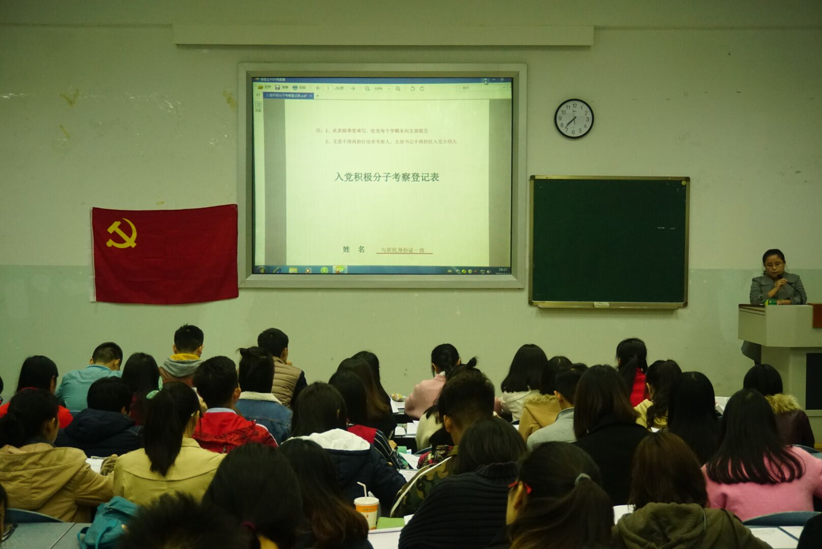会上,张翅从入党积极分子说起,通过对《入党积极分子培养考察登记表》、《入党志愿书》以及《预备党员培养教育考察登记表》等相关表格资料填写方法的解读,回顾了整个党员发展工作的基本原则和程序。年满十八周岁,自愿向党组织提出入党申请,经党支部讨论同意后方能确定为入党积极分子。发展党员工作的基本程序包括:自愿向党组织提出入党申请、入党积极分子的确定及培养、发展对象的确定、政审及公示、预备党员的接收、预备党员的教育考察和转正。张翅指出,今后的党员发展工作要严格遵守相关原则,进一步规范党员发展程序。她还强调了有关表格资料中时间节点准确填写的重要性,明确了表格中本人简历、家庭主要成员情况等一系列内容的填写方式及规范,并为在场同学解决了内容填写方面的疑问。