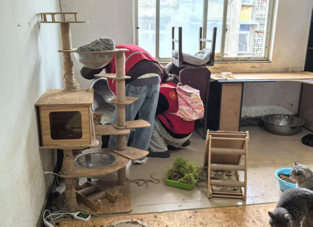 流浪猫基地的卫生条件较差,猫咪的排泄物随处可见,空气中弥漫着浓烈的异味。志愿者尼玛拉姆表示:“数十只流浪猫蜷缩在角落,周围环境的脏乱与它们纯真的眼神形成了鲜明对比。我感到心疼但也坚定了我帮助它们的决心。”志愿者们迅速分组,领取了清洁工具,开始了有序的打扫工作。一部分志愿者负责清理猫砂盆内的排泄物,另一部分志愿者则使用扫帚、拖把等工具对地面污渍进行彻底清洁。大家分工明确,配合默契,每个人都全力以赴,专注为流浪猫们创造一个更加干净、舒适的生活环境。