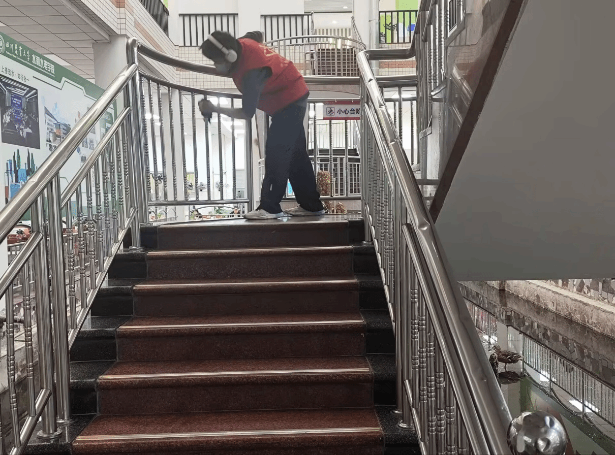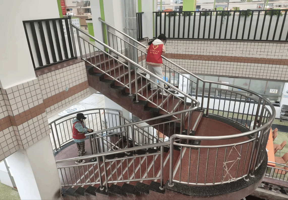 “擦拭扶梯栏杆后,看到原本略显斑驳的栏杆逐渐恢复洁净光泽,这让我感受到自己的劳动是有意义的。” 参与活动的志愿者刘馨莲兴奋地表示。看似简单的擦拭工作,让他深刻体会到后勤工作人员的日常辛劳,也更加明白 “整洁环境需共同守护”的道理。