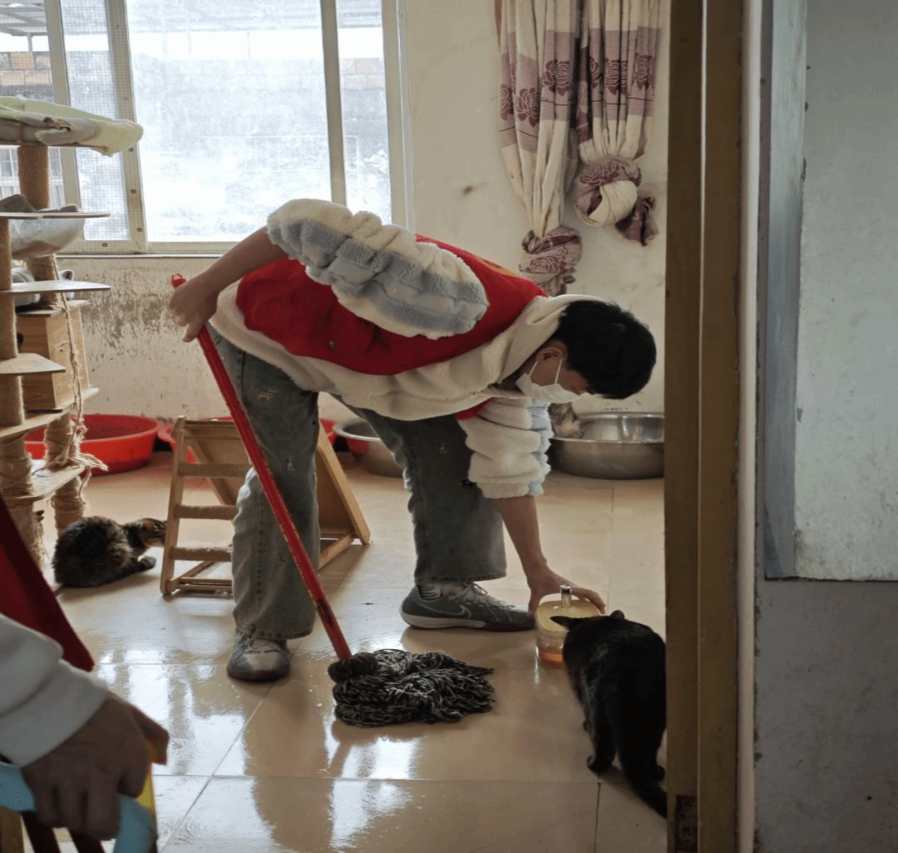 而在进行活动的过程中,志愿者们也没有怨言始终保持着耐心,对于地上的固体粪便就用猫砂覆盖,随后铲起,而流状污渍就用猫砂覆盖后,用扫帚进行扫除,尽管辛苦,却也十分严谨而清晰地按照“先铲后扫再细洗最后拖洗”的顺序有序展开清晰,优先铲去体积较大易去除的固体粪便,然后扫除散落四周的猫砂,与此同时,负责人安排志愿者对器具进行清洗以确保高效利用时间,为拖洗充分做好前置清扫后尽快进行拖洗,力求高效果,高效率,充分确保清除所有污渍。在打扫之余,猫咪们紧张却又温顺地靠近并亲近志愿者,志愿者们无不欣慰而暖心,大家纷纷表示一切努力都是值得的。