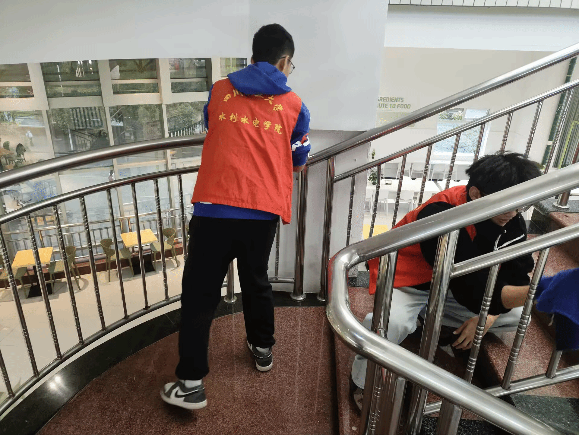 经过两个小时的辛勤付出,原本沾有灰尘和手印的扶梯栏杆变得锃亮洁净,为杏苑餐厅增添了一抹整洁的亮色。本次参加清洁的志愿者肖曾涵表示:“食堂扶梯栏杆在我们的努力帮助下焕然一新,一想到同学们看到洁净的栏杆就餐心情会很好,我也感到异常满足。”
