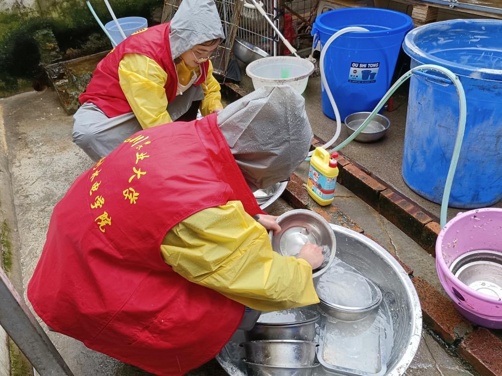 志愿者们身着志愿服来到救助基地,山路崎岖,雨水还冲击着山林,不远处是由红砖头堆成的小厂房,铁皮顶棚,两边排放着大小铁笼,中间挤出的小块活动场地很简陋,但却是基地的阿姨们最大的努力。救助基地的工作人员正在给流浪狗们准备食物,工作人员介绍到平时给狗狗的食物就是狗粮,而今天是一个月一次的,给狗狗特别准备的食物,有肉、米饭、玉米等等。 在准备食物的时候,志愿者们拿起锄头和簸箕将地上狗狗的便便都铲起来,收集在垃圾袋里。将场地收拾干净后,工作人员和志愿者们一起给狗狗分发食物,志愿者们把一盆又一盆的饭摆在场地上,狗狗们就迫不及待地涌上来围住饭盆,看到大大小小的狗狗们摇着尾巴吃得很香,志愿者们都不禁笑了起来。狗狗们吃饱喝足后,就轮到志愿者们忙碌了,志愿者需要把二三十个铁盆收集起来并清洗干净,面对堆积成小山的铁盆,志愿者也并没有退缩。流浪狗之家的狗狗普遍都缺乏安全感,渴望别人的抚摸,所以有的狗狗会走到志愿者的脚边亲昵地蹭志愿者的腿,有的甚至会扑上来,舔志愿者的手。一位志愿者表示,这些“毛孩子”真是既可气又可爱,它们脏脏的,但是又特别粘人,它们望着你的眼神就好像在说:“你是我在等待的主人吗?”另一位志愿者表示,流浪狗之家不仅给了流浪狗们一个安全温暖的家,还减少了城市中流浪狗的数量,改善了城市的风貌。
