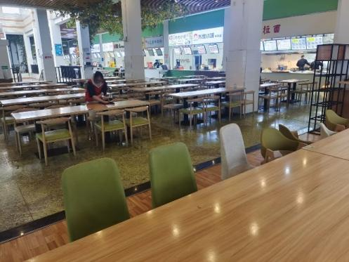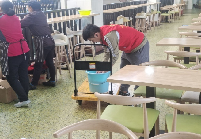 3月19日上午8:20,七位同学进行集合,并对活动人员进行了任务分配。一部分志愿者的任务是进行食堂桌子的摆放,借助简易的线性工具下,使桌子被整齐的摆放;另一部分志愿者的任务是用抹布对桌面油污、食物残渣进行清除,以及擦洗椅子、桌子和地面等工作。每名志愿者都怀着积极的态度投入到此次的活动中,志愿者们互相配合,齐心协力,每个人一丝不苟,各项清洁活动有条不紊地进行。在各名志愿者的默契配合下,清洁任务顺利完成。