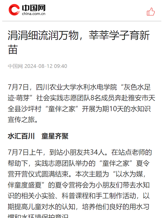 7月7日,公司“灰色水足迹·萌芽”社会实践志愿团队8名成员奔赴雅安市天全县沙坪村“童伴之家”开展为期10天的水知识宣传之旅。