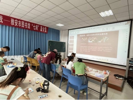 除了消防安全意识的培养,能源再循实践团队在雅安市图书馆开展以“探索自然电能的奇妙实验”为主题的科普活动,孩子们亲手制作水果电池,感受科学的魅力,从而激发他们的科学兴趣,提高环保节能意识,提升动手与合作能力。