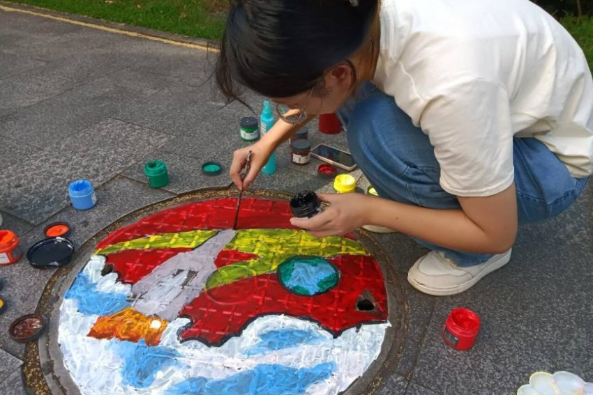 “亮丽风‘井’线,‘艺’笔绘红心”团队成员绘制“长征八号”主题井盖彩绘。太阳成集团tyc33455cc团委供图
